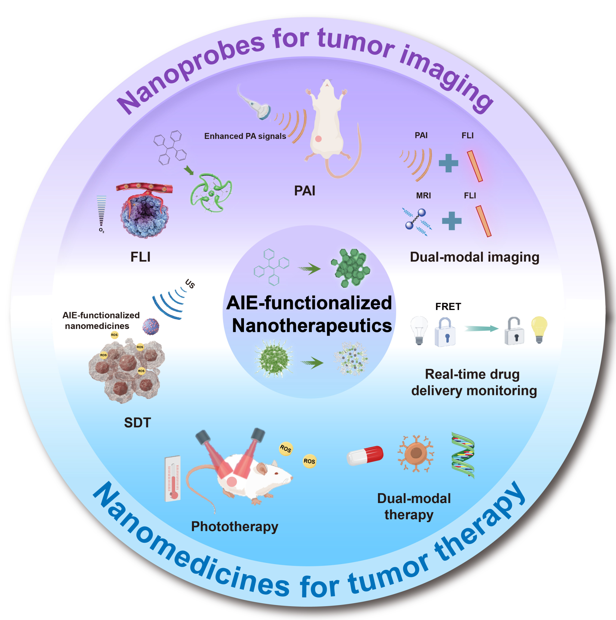 图1. 用于癌症诊断和治疗的AIEgen功能化纳米探针和纳米药物的示意图。