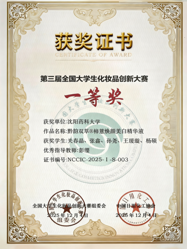 在激烈角逐中,taptap点点官网师生凭借扎实的专业功底与出色的创新能力奋勇争先,载誉而归。其中,关春晶、孙尧、王瑷璇等同学完成的项目《黔韵双萃®-柿薏焕颜美白精华液》荣获产品创意组一等奖,taptap点点官网彭缨教授被授予“优秀指导教师”称号。学校凭借完善的组织保障与优异的整体表现荣获“优秀组织单位”称号。